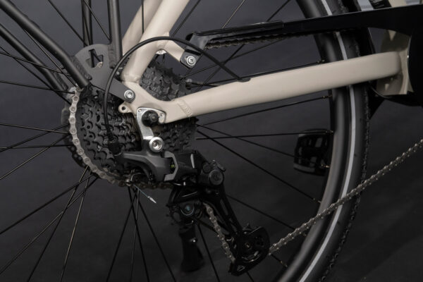 Angetrieben wird das Pedelec von einem leistungsstarken 250 Watt / 36 Volt Mittelmotor. Durch die mittige Position verteilt sich das Gewicht des Motors gleichmäßig auf Vorder- und Hinterrad. Die Rahmenform sorgt mit dem niedrigen Einstieg für mehr Sicherheit und Fahrkomfort. Der Hochleistungsakku mit 720 Wh verschwindet im Unterrohr und lässt sich mit wenigen Handgriffen zum Laden entnehmen.